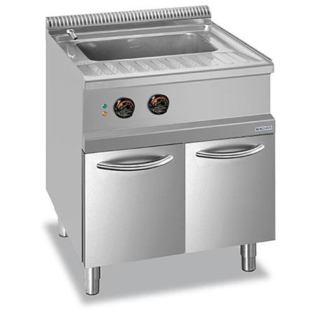 Resistências elétricas em aço inox «incoloy» equipadas no exterior do fundo da cuba; temperatura regulável; indicador luminoso de funcionamento e termóstato de segurança que interrompe o funcionamento na ausência de água na cuba